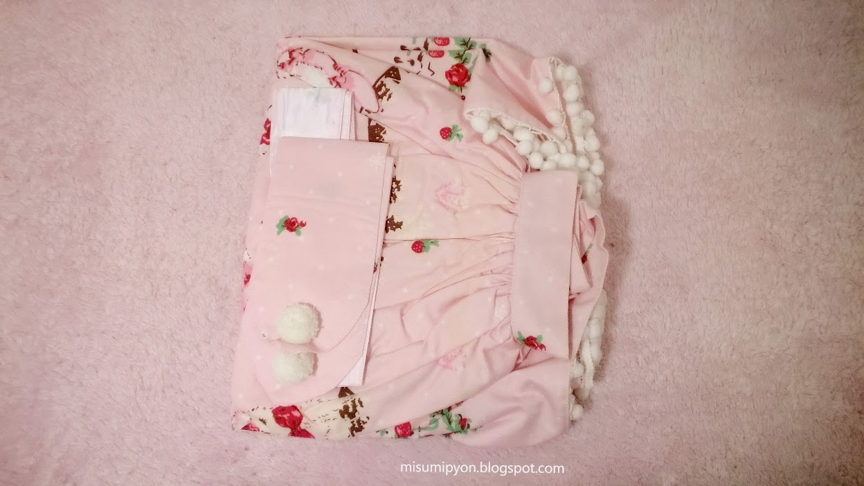 Tada~! Bunnies and strawberries everywhere! I love the bright yet soft pink color, its very sweet lolita like and perfect for spring / summer cords!